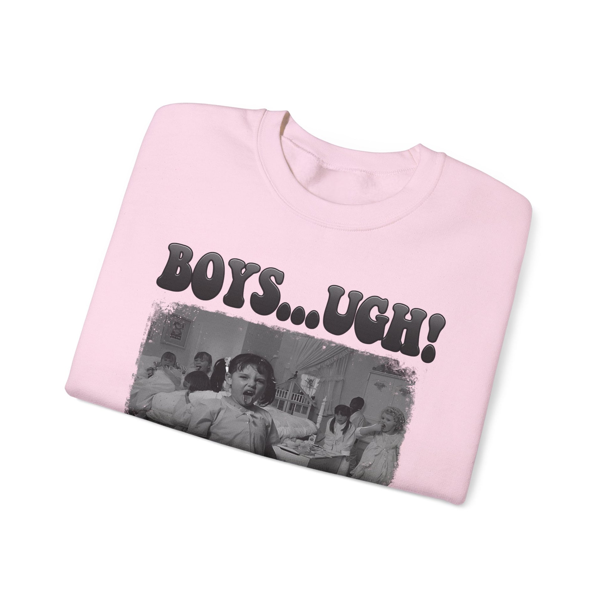 Soft, slightly oversized, and a little bit sassy — this crewneck brings a vintage black-and-white vibe to everyday comfort. The front features a distressed photo print framed beneath bold, retro lettering that reads “BOYS...UGH!” with a checkerboard accent beneath, giving the sweatshirt a playful, punk-adjacent edge. Wear it on slow mornings, road-trip playlists, or when you just want to roll your eyes in style. The medium-heavy cotton/poly blend feels warm without weighing you down, the ribbed collar and cuffs hold their shape, and thoughtful construction (double-needle stitching, tubular knit body) keeps it looking tidy wash after wash. It’s the kind of layer that slips on easily, pairs with denim or leggings, and says more with less — a quiet, relatable statement piece for anyone who likes humor, vintage aesthetics, and comfortable staples.