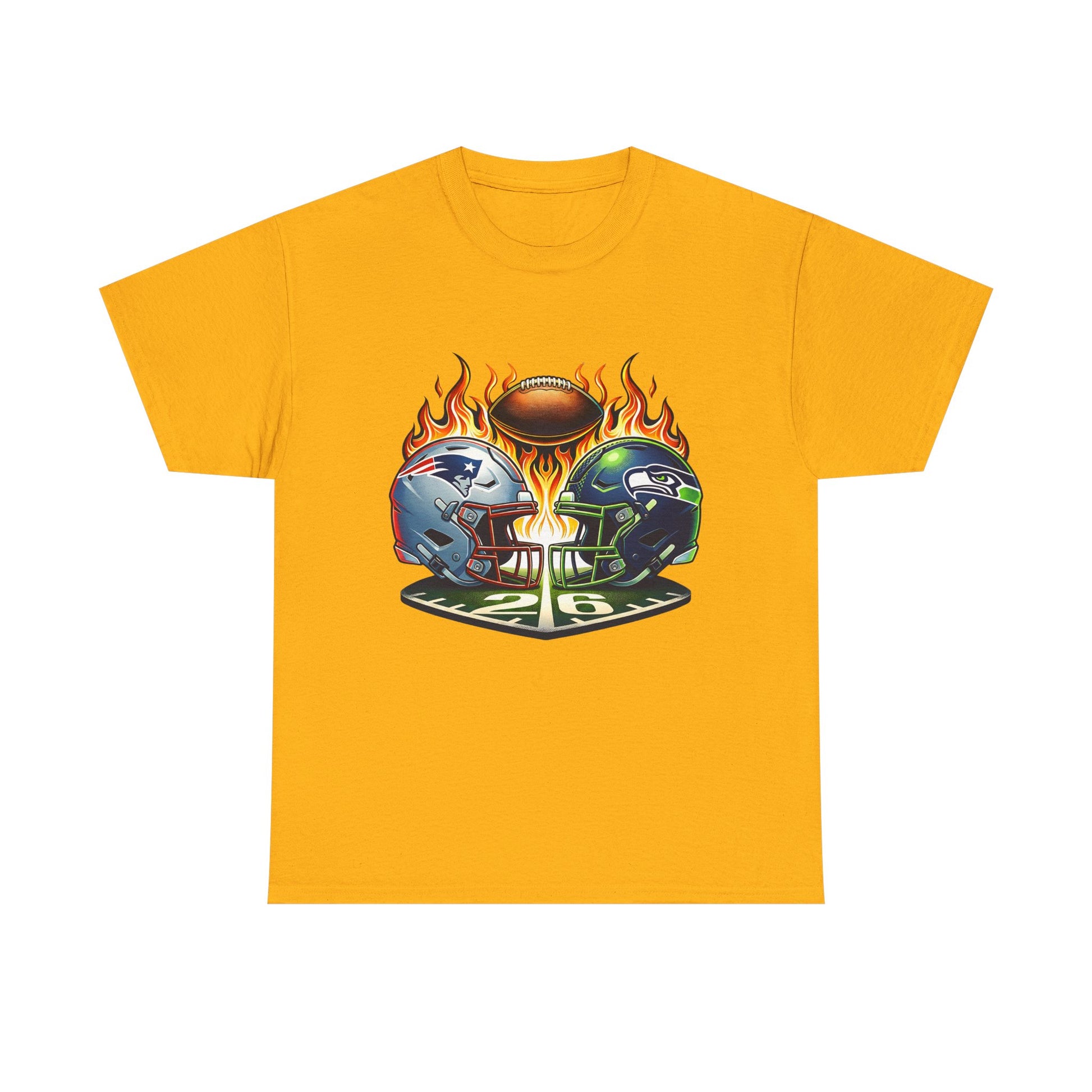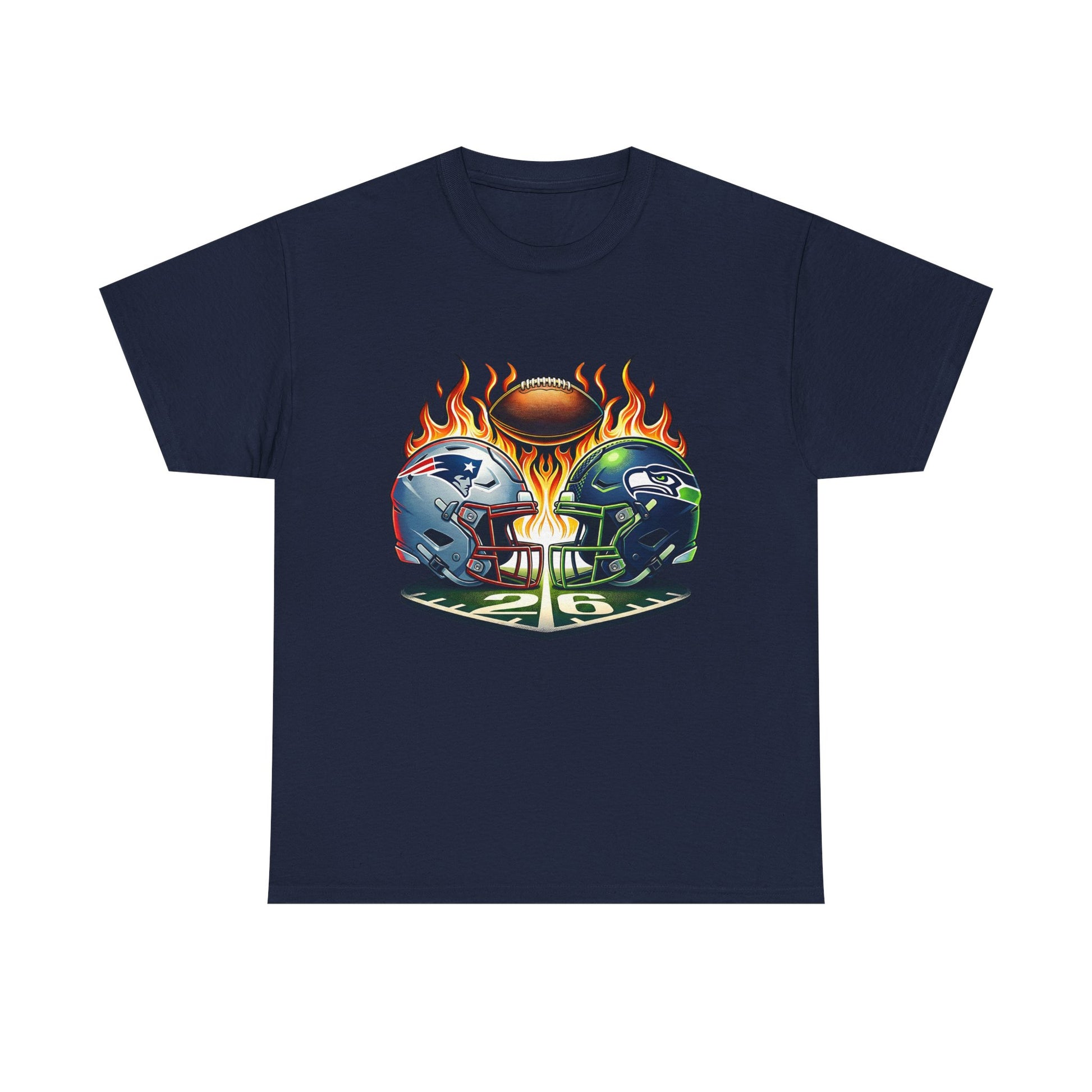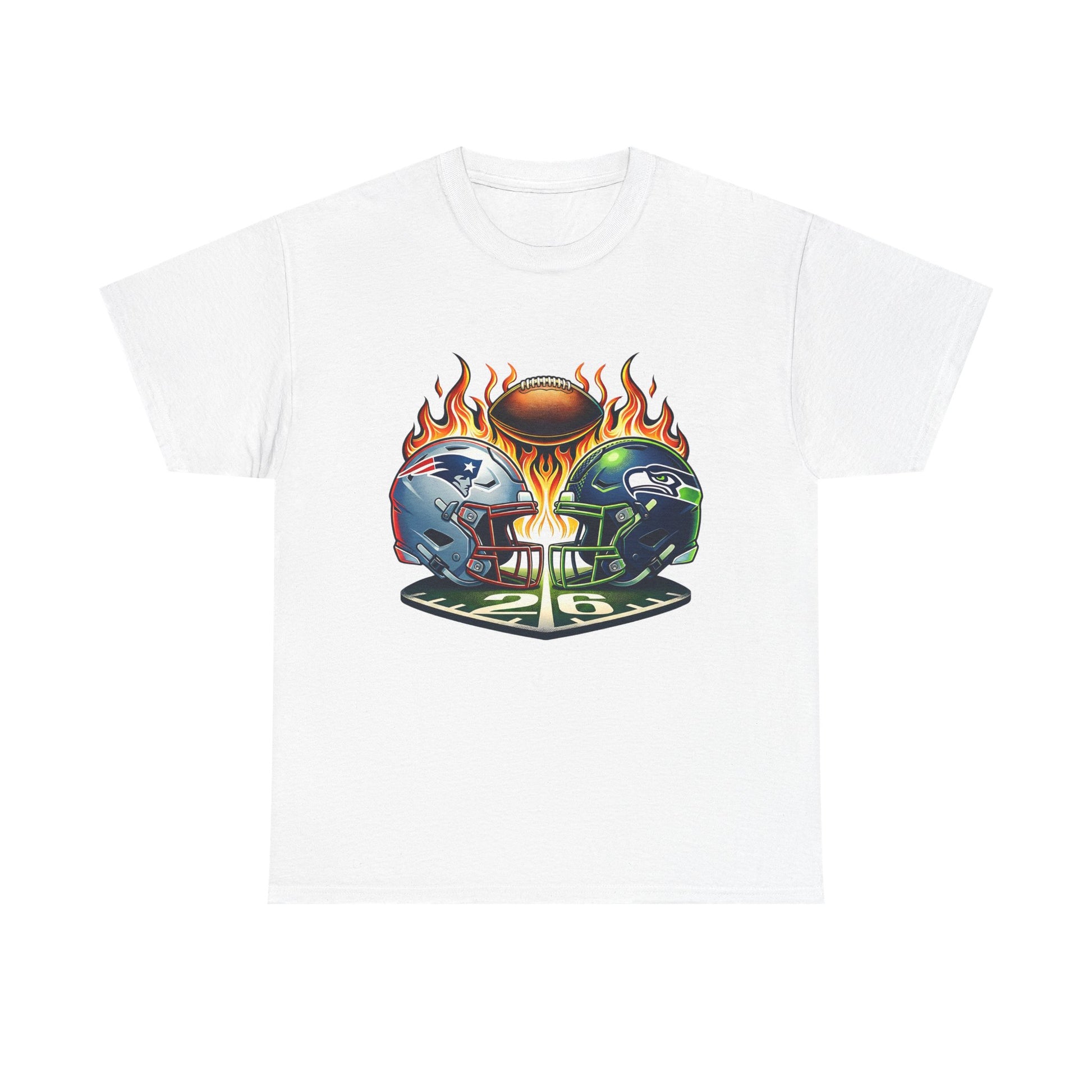 This shirt puts game-day heat front and center. A crisp, high-contrast print shows two helmets locked in rivalry above a flaming football—bold colors and sharp detail that stand out on the classic white tee. Wear it to the backyard watch party, the pub, or while cheering from the couch. The relaxed crew-neck fit and midweight cotton feel familiar and easy all afternoon. The print sits mid-chest so it reads on photos and in crowds, while the tear-away label keeps you comfortable through the longest drives and overtime nail-biters.