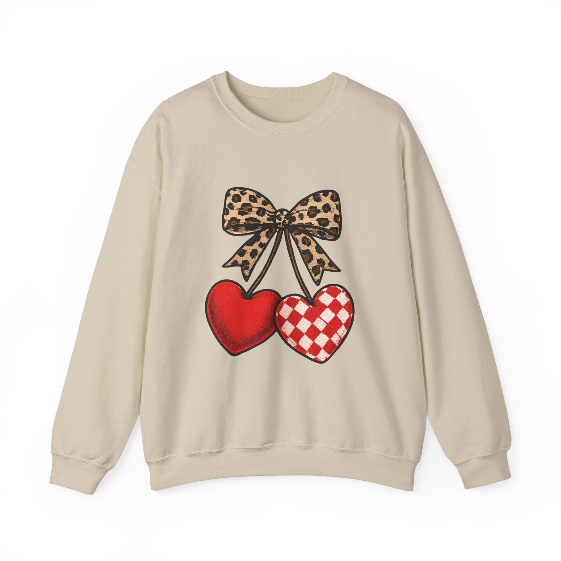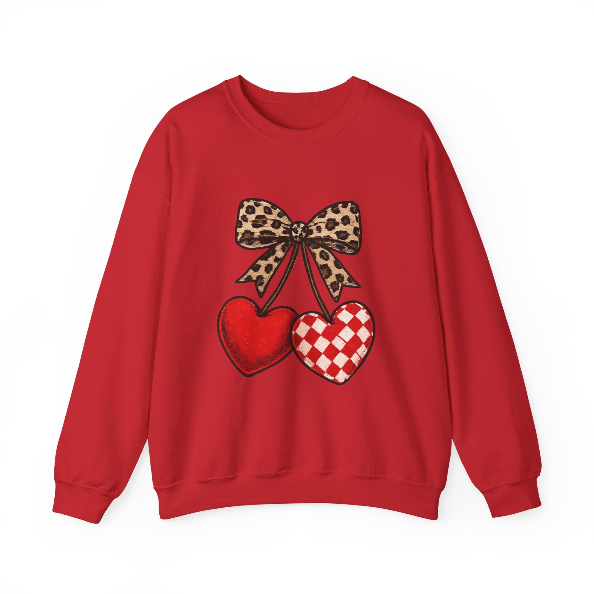 Soft, cozy, and a little bit playful — this crewneck brings a touch of vintage Valentine charm to everyday wear. Two plush hearts hang beneath a leopard-print bow, stitched in warm reds and cream against a deep black background. It feels like slipping into a blanket that remembers a favorite roadside bakery and a Saturday afternoon thrift hunt. Wear it on chilly coffee runs, low-key date nights, or lazy weekends around friends who appreciate a little pattern play and heart-forward humor.