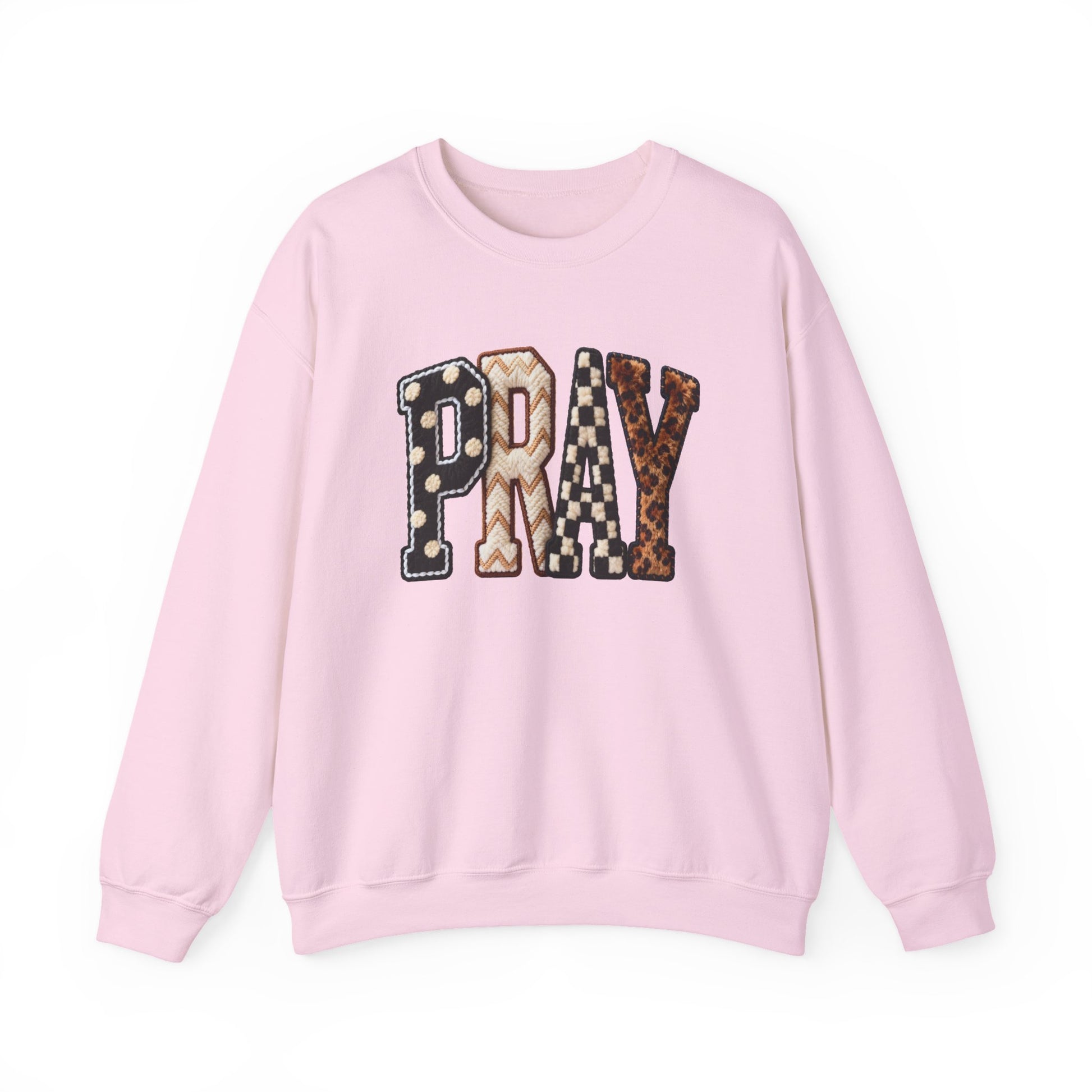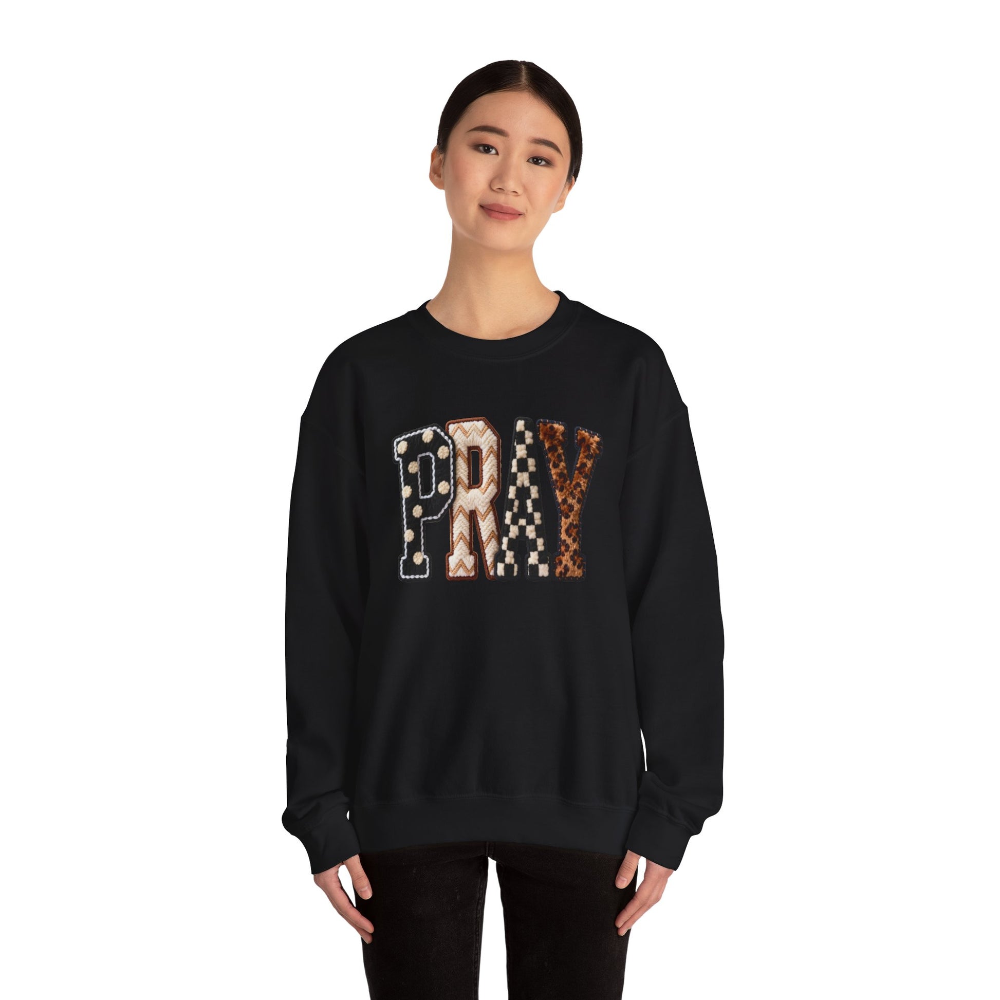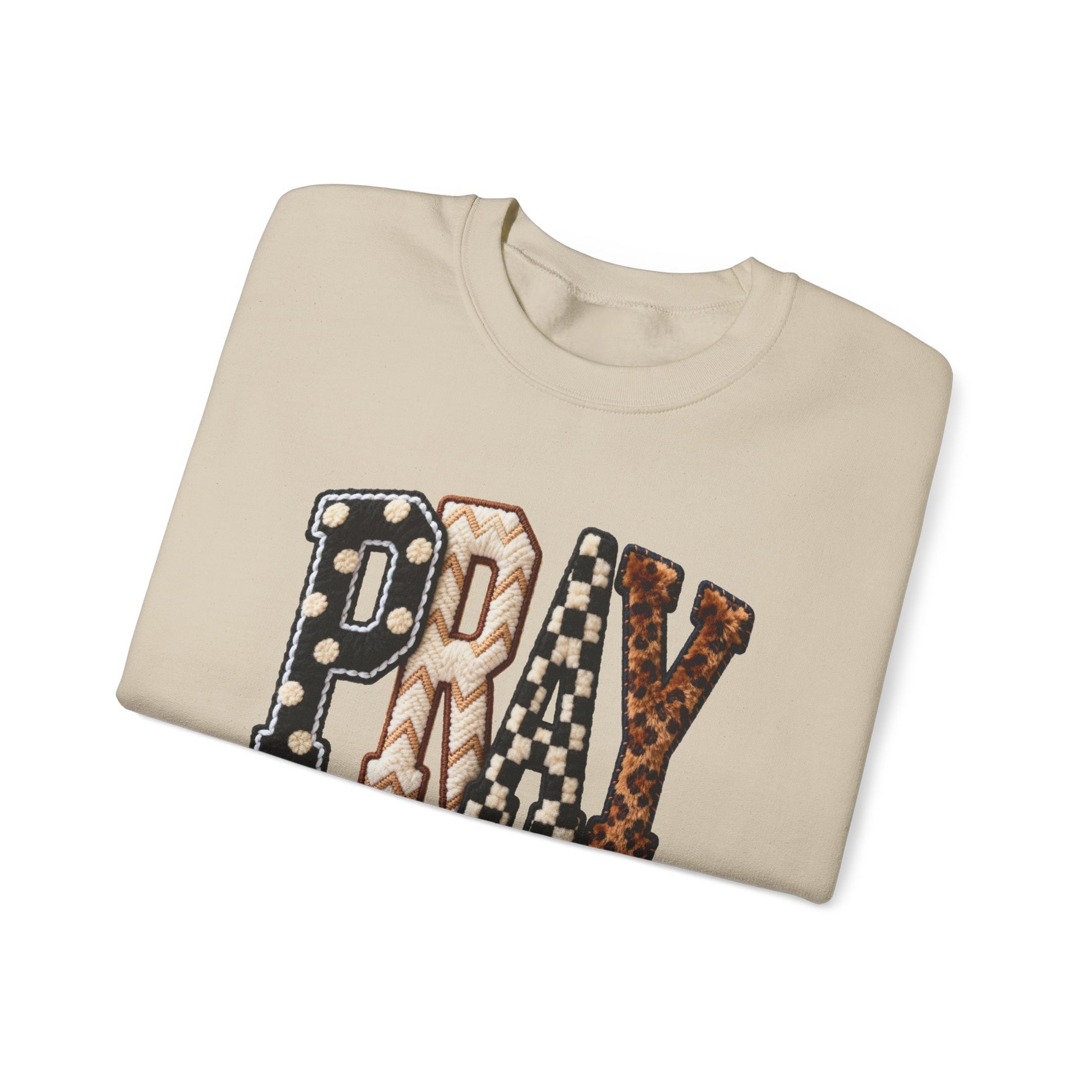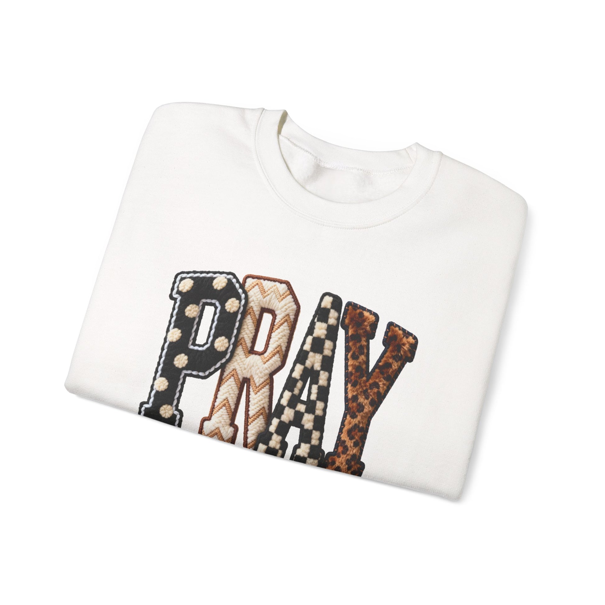 Soft, lived-in comfort meets quiet meaning. This crewneck carries a warm, homespun vibe: bold patchwork letters spell PRAY across the chest in mixed prints—polka dots, plaid and leather-like textures—set against a clean, creamy sweatshirt. It hangs relaxed on the body, with a classic crew neckline and ribbed cuffs that hold their shape. Wear it on slow mornings with coffee, at evening gatherings, or layered under a jacket for cooler walks. The embroidered-look lettering adds tactile detail without shouting; the result is cozy, thoughtful, and easy to fold into everyday routines.